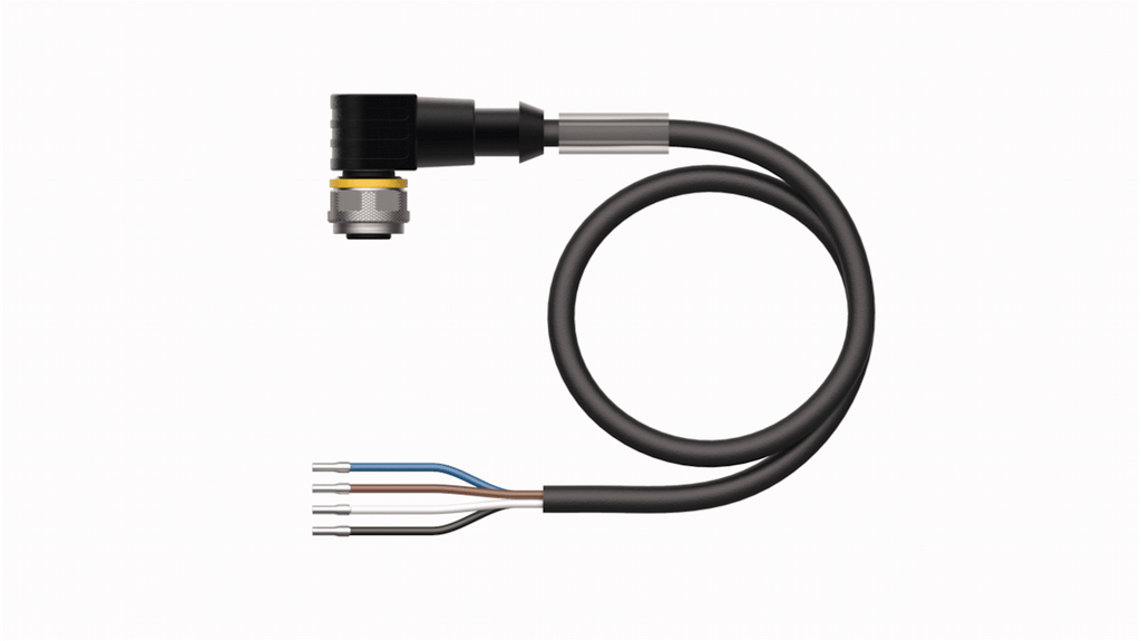 Cavo per attuatori e sensori con connettore femmina M12 angolato a 4 pin, lunghezza 2m, giacca in materiale PUR nero, resistente a agenti chimici, raggi UV e oli, classe di protezione IP67 e IP69K, privo di alogeni, silicone, PVC e LABS, particolarmente resistente all'abrasione, adatto per uso in catene di trascinamento, codice costruttore WKC4.4T-2/TXL, marchio Turck.