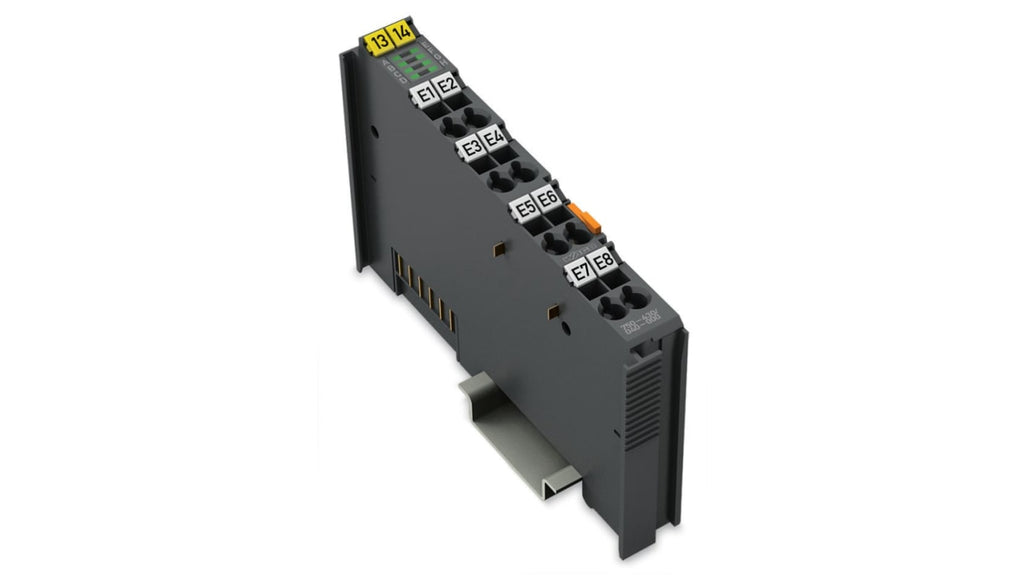 Modulo di ingresso digitale per PLC, 8 canali, serie 750, tensione di alimentazione 24 V c.c., montaggio su guida DIN 35, contenitore in policarbonato e poliammide 6.6, conforme a RoHS.