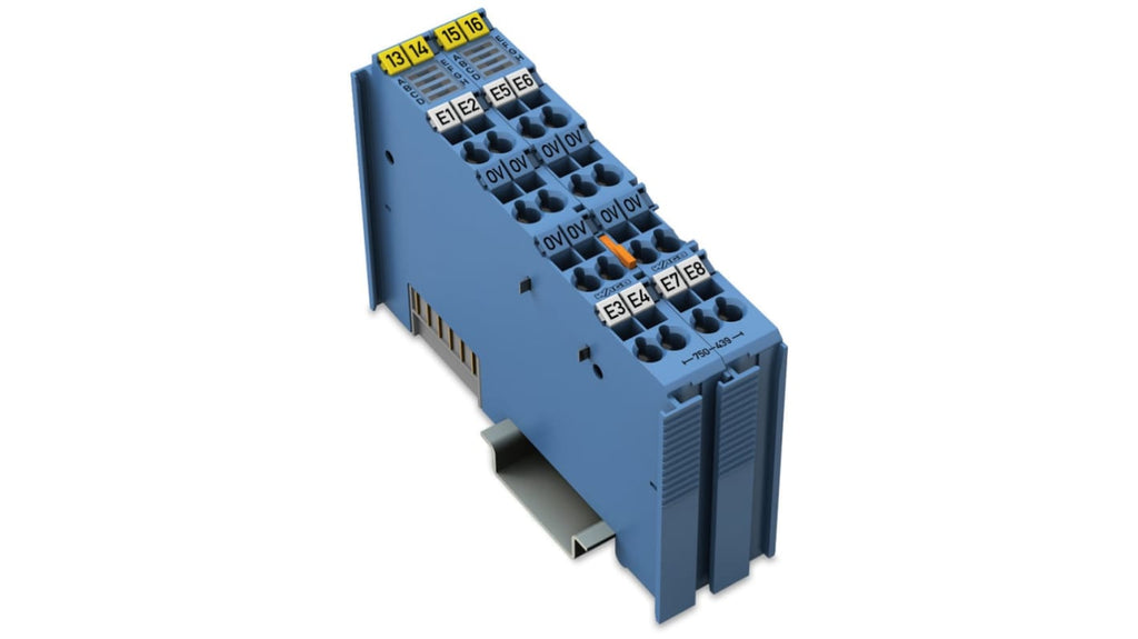 Modulo di ingresso digitale per PLC, 8 canali, serie 750, tensione di alimentazione 24 V c.c., montaggio su guida DIN 35, contenitore in policarbonato e poliammide 6.6, conforme a RoHS.