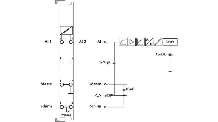 Modulo di ingresso analogico per PLC, 2 canali, serie 750, Wago. Realizzato in policarbonato e poliammide 6.6, conforme a RoHS. Montaggio su guida DIN 35. Tensione di alimentazione 5 V CC. Tipo di ingresso analogico.