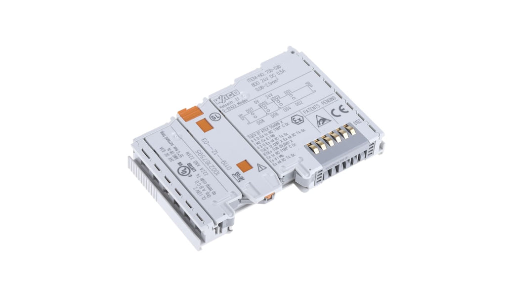 Modulo I/O PLC Wago, serie 750, digitale, otto uscite, corrente di uscita 0,5 A per canale, frequenza di commutazione 2 kHz, tensione di alimentazione 5 V c.c., montaggio su guida DIN standard da 35 mm, dimensioni 67,8 x 12 x 100 mm, temperatura operativa da 0 a +55 gradi Celsius, protezione contro cortocircuiti, indicatori di stato a LED.