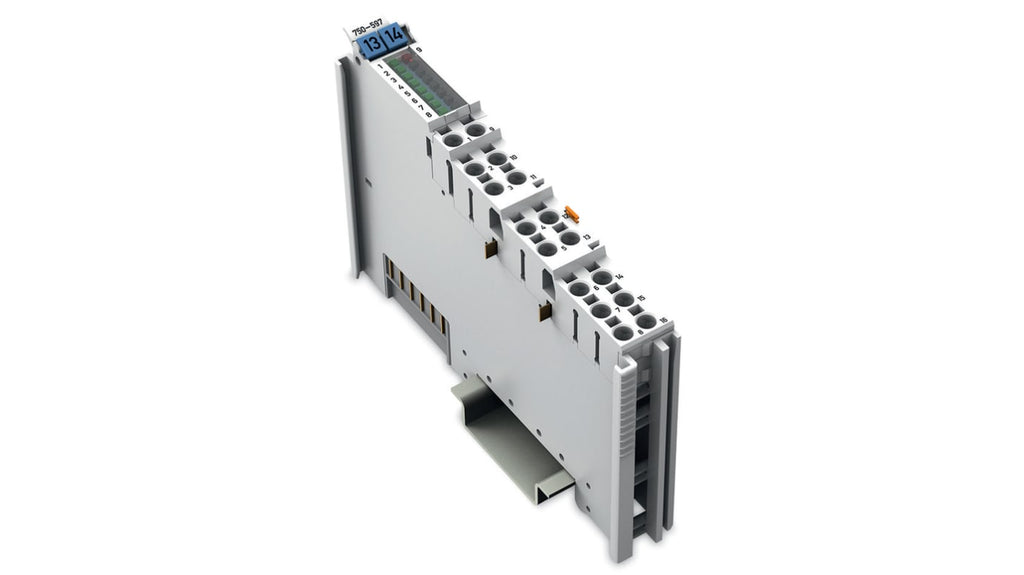 Modulo di distribuzione di potenza digitale Wago, serie 750, con 8 canali di uscita analogici 0-10 V e ±10 V, risoluzione 12 bit, alimentazione laterale 24 V, grado di protezione IP20, montaggio su guida DIN-35, 16 ingressi/uscite con morsetto a gabbia push-in, potenziale di terra comune per i canali di uscita, dimensioni 3,937 x 0,472 x 2,717 poll.