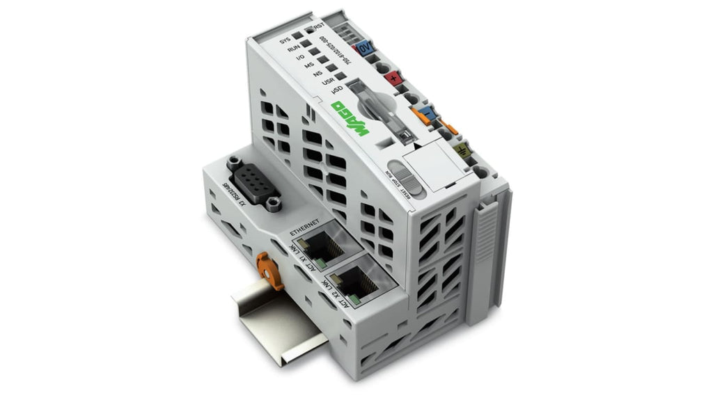 Modulo di comunicazione Wago PFC100, 2 ingressi, tensione di alimentazione 24 V, dotato di 2 porte Ethernet, interfacce seriali RS 232 e RS 485, compatibile con moduli analogici digitali, interruttore integrato per cablaggio topologico, server Web integrato per configurazione utente, conforme a RoHS, senza necessità di manutenzione, grado di protezione IP20, sistema operativo Linux 3.18.