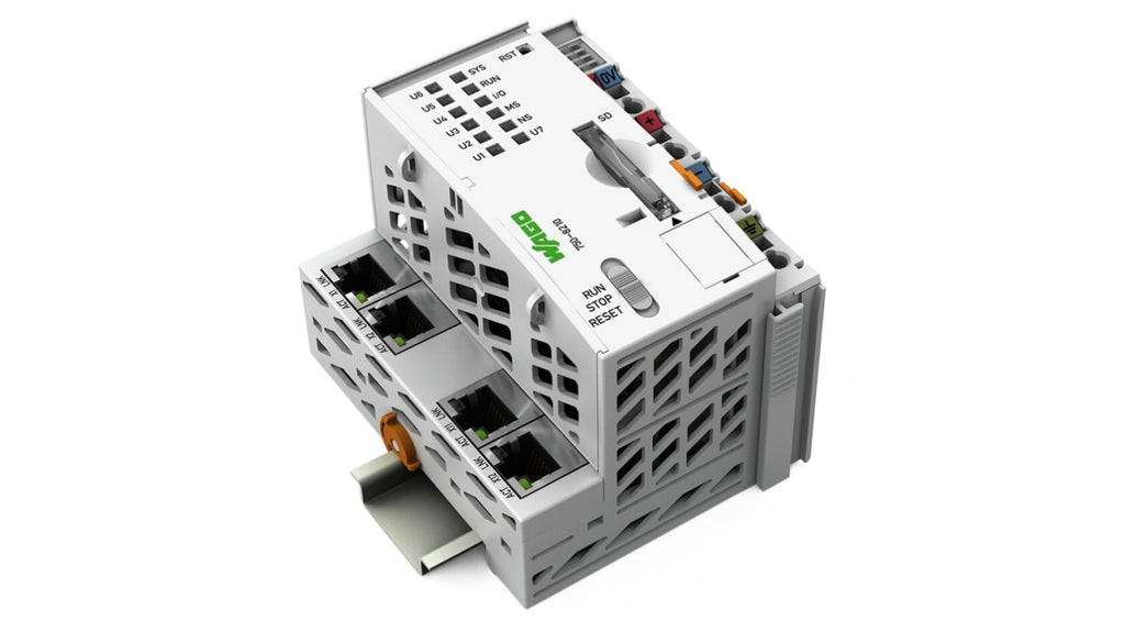 Modulo di comunicazione Wago PFC200, 4 ingressi, tensione di alimentazione 24 V, PLC compatto per sistema I/O modulare, supporta moduli digitali, analogici e speciali serie 750/753, due interfacce Ethernet, interruttore integrato, server Web per configurazione e monitoraggio, programmazione secondo IEC 61131-3, sistema operativo Linux con patch pre-empt RT, configurazione tramite CODESYS o interfaccia web, senza necessità di manutenzione.
