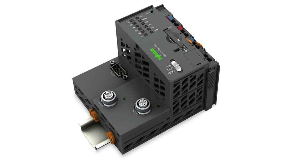 Modulo di comunicazione Wago PFC200, PLC compatto per sistema I/O modulare, ingressi: 2, tensione di alimentazione: 24 V, programmazione secondo IEC 61131-3, sistema operativo Linux con patch RT-Pre-empt, immunità alle tensioni di impulso e interferenze elettromagnetiche, resistenza a vibrazioni e urti, due interfacce Ethernet, interruttore integrato, server Web per configurazione utente e monitoraggio stato.