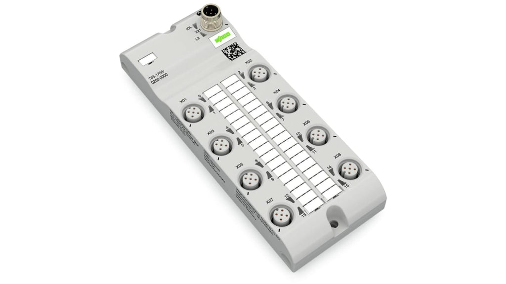 Modulo I/O digitale Wago, serie 765, per PLC, 16 ingressi e uscite digitali, tensione di alimentazione 24 V c.c., corrente di uscita 2,0 A, hub IO Link classe B, collegamento 8xM12 con HubLine, protezione contro l'inversione di tensione, conformità RoHS.