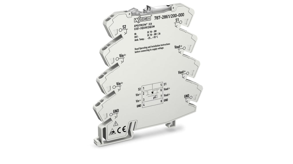 Interruttore automatico elettronico Wago, 1 canale, 24VDC, 2A, tensione nominale 30V, capacità di rottura 15A, montaggio guida DIN, dimensioni 94mm x 6mm x 97.8mm, codice costruttore 787-2861/200-000.