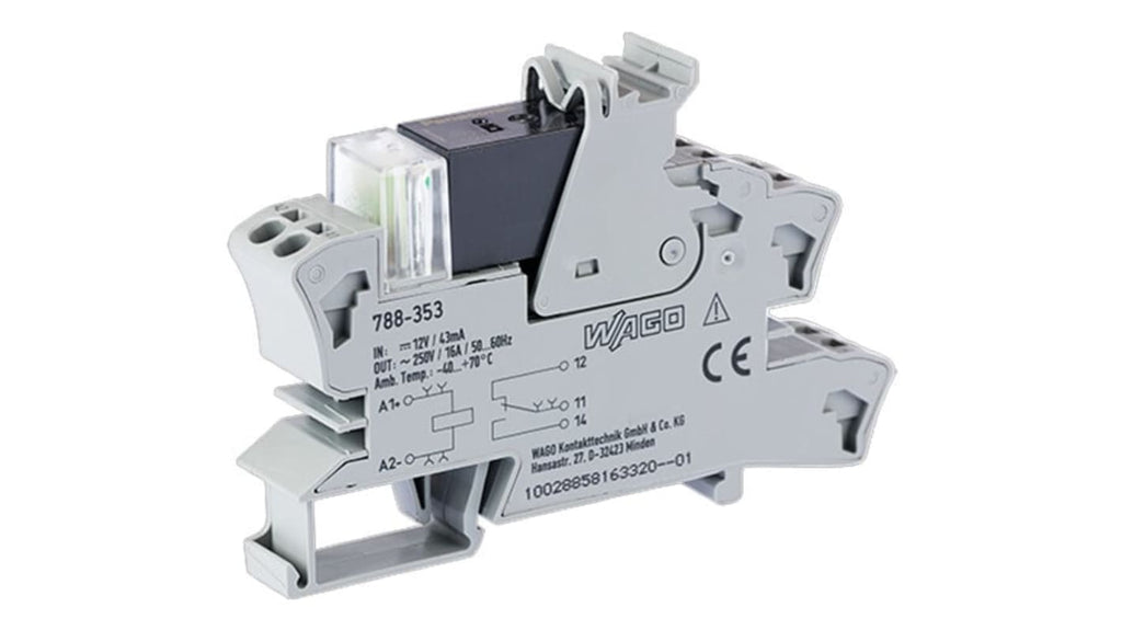 Modulo relè per guida DIN. Tensione bobina 12V cc, configurazione contatto SPDT, corrente di carico 16A, montaggio su guida DIN-35. Tecnologia di collegamento con morsetto a gabbia, contatti in lega d'argento. Conforme a RoHS. Serie 788. Codice costruttore 788-353.