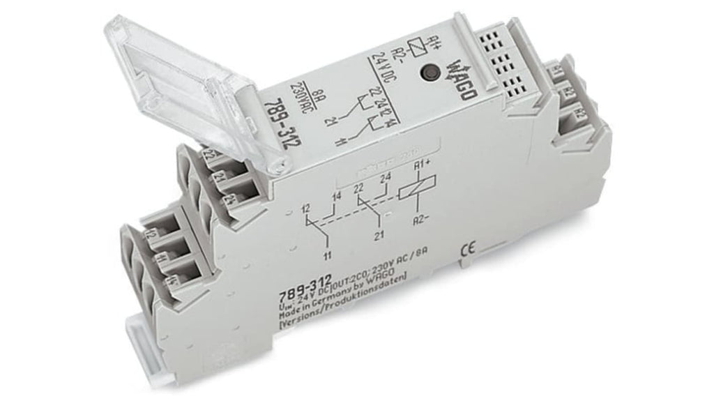Modulo relè per guida DIN. Tensione bobina 24V cc, configurazione contatto DPDT, corrente di carico 8A, numero di poli 2. Tecnologia di collegamento con morsetto a gabbia, contatti in lega d'argento. Conforme a RoHS, tipo di montaggio guida DIN-35. Serie 789.