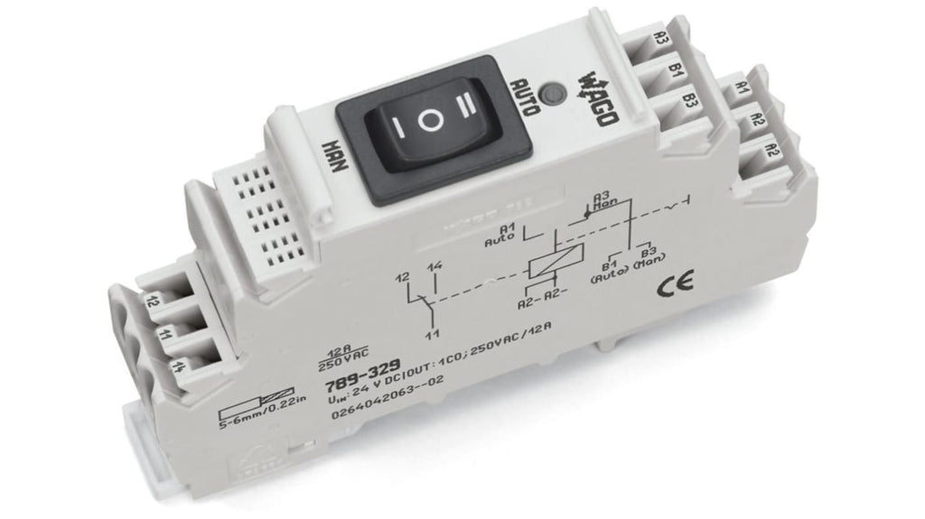 Modulo relè per guida DIN. Tensione bobina 24V cc, configurazione contatto SPDT, corrente di carico 12A, montaggio su guida DIN-35. Tecnologia di collegamento con morsetto a gabbia, contatti in lega d'argento. Conforme a RoHS. Serie 789. Codice costruttore 789-329.