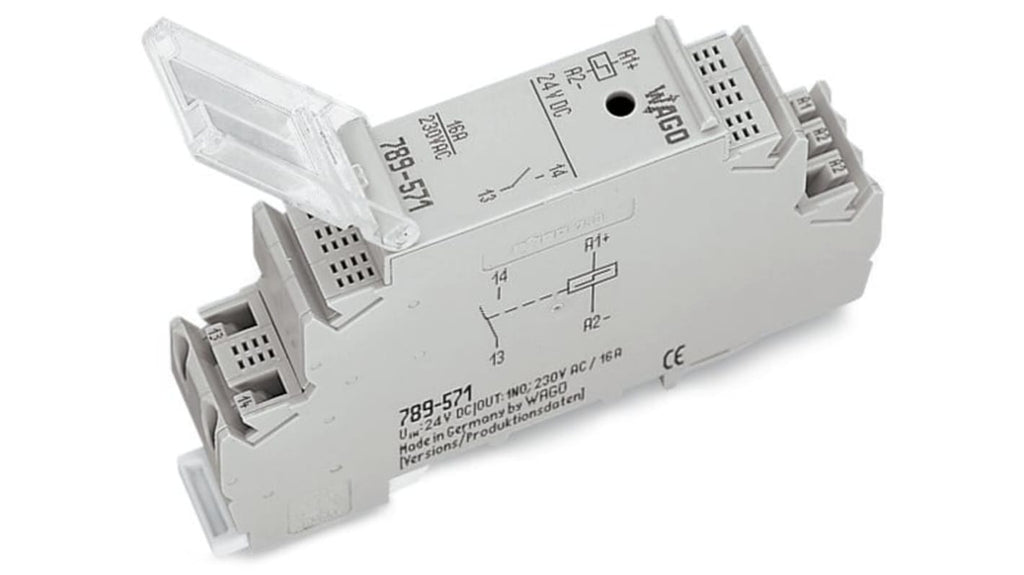 Modulo relè bistabile per guida DIN. Codice costruttore 789-571, marchio Wago. Montaggio su guida DIN-35, corrente di commutazione 82mA, tecnologia di collegamento con morsetto a gabbia, contatti in lega d'argento. Conforme a RoHS.