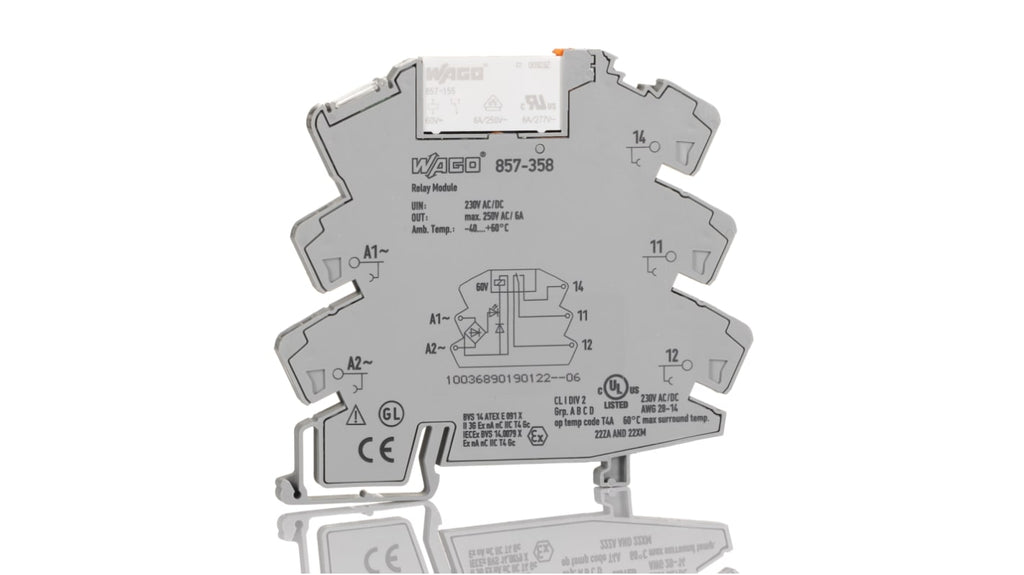Relè d'interfaccia Wago, bobina 230V ca/cc, montaggio su guida DIN, corrente nominale 6 A, contatti in argento nichel, terminali a innesto, dimensioni 6 x 94 x 81 mm, vita operativa 50000 operazioni elettriche, temperatura operativa -25 a +60 gradi, LED giallo integrato, soddisfa standard GL, ANSI/ISA 12.12.01, EN 60664-1, EN 61810-1, UL 508.