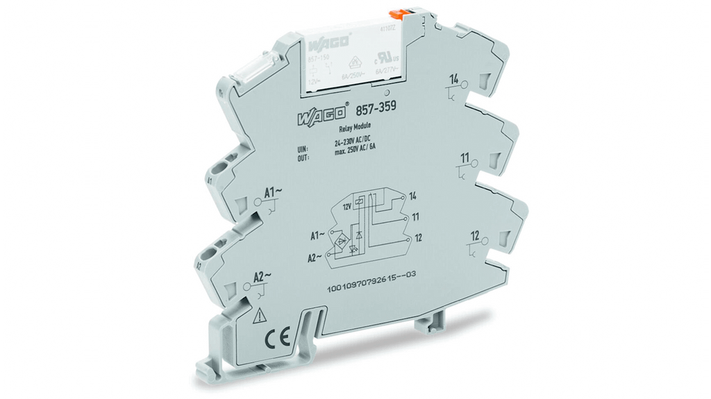Relè d'interfaccia Wago serie 857, bobina 230V ca/cc, configurazione contatti SPDT, montaggio su guida DIN, corrente di carico 6A, tensione in ingresso massima 230V ca/cc, tensione minima in ingresso 24V ca/cc, materiale contatti lega di argento, grado di protezione IP20, indicazione LED, temperatura di esercizio -40 a +70 gradi, dimensioni 6 x 81 x 94 mm, vita meccanica 5 x 10^6 cicli, vita elettrica 50 x 10^3 cicli, standard EN 50121-3-2, EN 61010-2-201, EN 61373, EN 61810-1, UL.