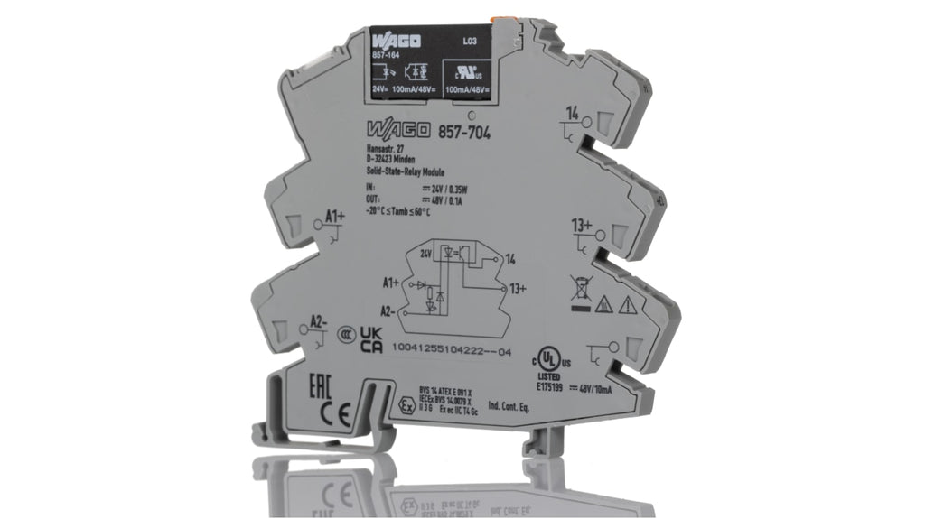 Relè a stato solido Wago, montaggio su guida DIN, corrente di carico massima 0,1 A, tensione di carico da 0 a 48 V c.c., tensione di controllo da 16,8 a 30 V c.c., morsetto a gabbia, uscita a transistor/triac, tecnologia a 2 conduttori, temperatura operativa da -20 a +60 gradi Celsius, dimensioni 94 x 6 x 81 mm, tempo di attivazione 0,1 ms, standard EAC.