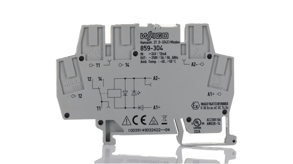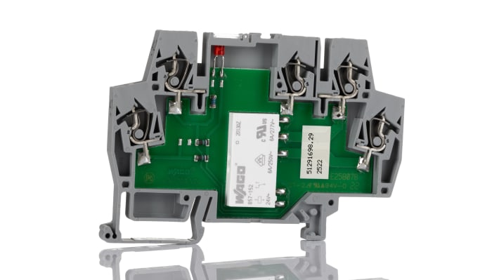 Relè d'interfaccia Wago, bobina 24V cc, montaggio su guida DIN, contatti in argento nichel, tensione di switching 250V ca, corrente in ingresso 10mA, indicatori di stato a LED, dimensioni 6 x 56 x 91mm, peso 22,9 g, temperatura operativa -40 a +50 gradi, vita meccanica 5000000 operazioni, standard EN 60664-1, GL, UL 508.