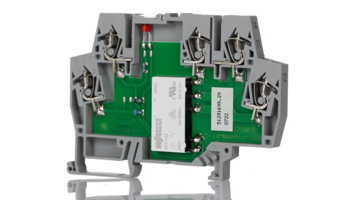 Relè d'interfaccia Wago serie 859, bobina 24V cc, configurazione SPDT, montaggio su guida DIN, contatti in lega d'argento, corrente di carico 5A, tensione di carico 250V ca, temperatura di esercizio -25 a +70 gradi Celsius, dimensioni 6 x 56 x 91 mm, morsetto a gabbia, indicazione LED, vita meccanica 5 x 10^6 cicli, vita elettrica 50 x 10^3 cicli, standard DNV GL TAA00001D1, EN 61010-2-201.