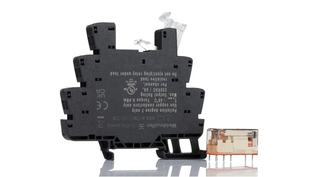 Relè d'interfaccia Weidmuller, tensione bobina 24 a 230V ca/cc, contatti DPDT, montaggio su guida DIN, corrente di carico 8A, dimensioni 12.8 x 87.8 x 89.6 mm, peso 61 g, gamma temperatura operativa -40 a +40 gradi, vita meccanica 30 milioni di cicli, materiali contatti in lega di argento, standard CE, CULus, EAC, conformità RoHS.