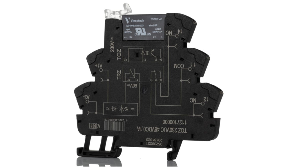 Relè di interfaccia a stato solido Weidmuller, tensione di controllo 230 V, corrente di carico massima 100 mA, configurazione contatti SPDT, montaggio su guida DIN, dimensioni 90 x 6.4 x 88 mm, peso 30.4 g, gamma di temperatura operativa -20 a +60 gradi, accetta conduttori 26-14 AWG, standard CE, CULus, EAC, conformità RoHS, codice produttore 1127100000.