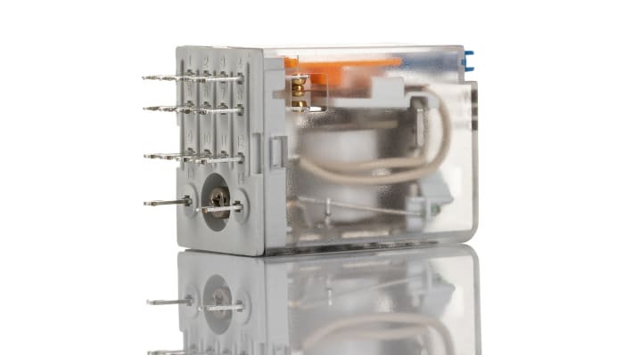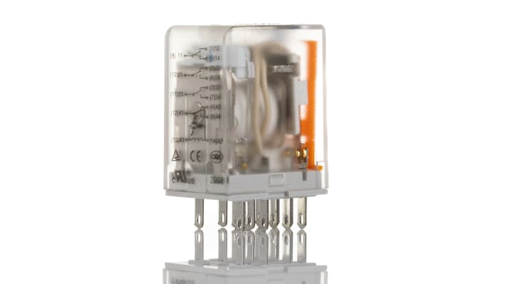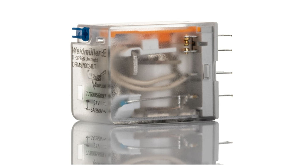 Relè di potenza Weidmuller, 4 poli, configurazione 4PDT, bobina 24V cc, montaggio a pannello, dimensioni 21.5 x 36 x 28 mm, corrente di commutazione 5A, potenza di commutazione massima 1,25 kVA, temperatura operativa da -40 a +60 gradi, contatti in lega d'argento, terminali a innesto, vita utile 20 milioni di cicli, standard cURus, pulsante di test incluso.