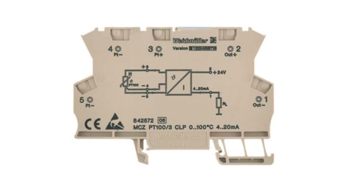 Condizionatore di segnale Weidmuller serie ACT20X, trasduttore temperatura PT100, montaggio su guida DIN, convertitore di segnali RTD in uscita di corrente 4-20mA, gamma di ingresso 0-100°C, temperatura di esercizio -25-50°C, tensione di alimentazione 30V, larghezza 6mm, autorizzato UL, CSA, marcatura CE.