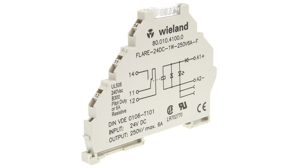 Modulo relè d'interfaccia per guida DIN, bobina 24V cc, contatti SPDT, larghezza 6,2mm, montaggio su guida DIN, morsetto a gabbia, corrente nominale 6A/250V, gamma tensione in ingresso 19,2-30V cc, temperatura operativa 0-60°C, LED di stato, diodi integrati per protezione polarità, dimensioni 70x6,2x98mm, standard CSA e UL. Codice costruttore 80.010.4100.0.
