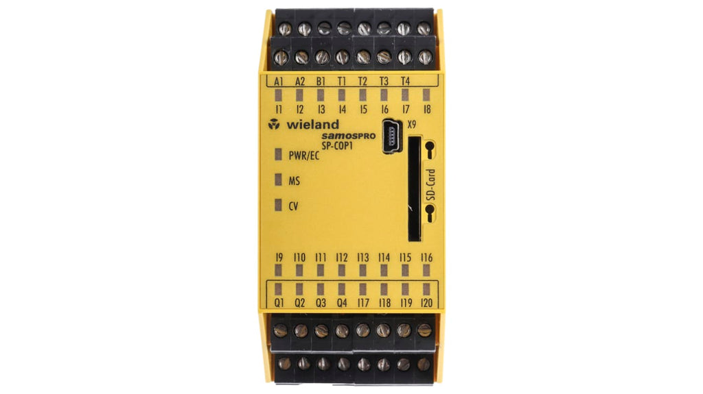 Controller di sicurezza Wieland Samos PRO COMPACT, 24 I/O, 20 ingressi sicuri, 4 uscite sicure, tensione di alimentazione 16,8-30 V c.c., corrente nominale contatto 4 A, grado di protezione IP20, dimensioni 45 x 96 x 115 mm, SIL 3, PL e/Categoria 4, interfacce USB ed Ethernet, espansione modulare fino a 172 I/O, temperatura ambiente da -25 a +65 °C.