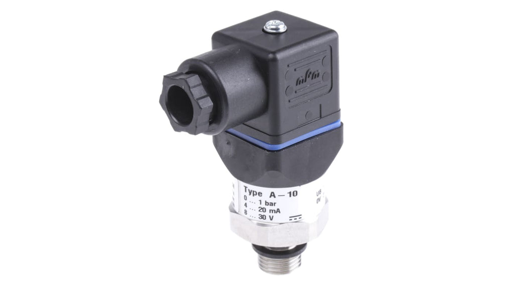 Trasmettitore di pressione WIKA, 1bar max, compatto per applicazioni idrauliche, elementi sensore piezo-resistivi, uscita elettrica 4 a 20 mA a 2 fili, collegamento con connettore maschio a L a 4 pin, tensione di alimentazione 8 a 30 V c.c., precisione in acciaio inox 1.4571 e 1.4301, temperatura operativa da 0 a 80 gradi Celsius, pressione minima 0 bar, pressione massima 1 bar.