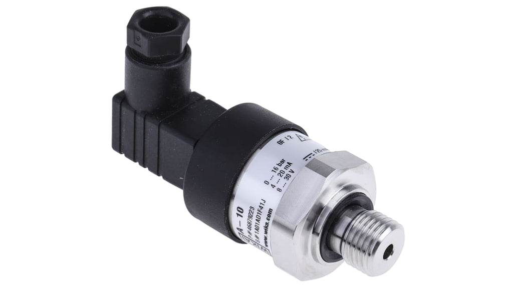 Sensore di pressione serie A10 WIKA, pressione massima 16 bar, uscita analogica 4-20 mA, precisione 0,5%, tempo di risposta inferiore a 4 ms, struttura in acciaio inox, grado di protezione IP65, temperatura operativa da 0 a 80 gradi Celsius, collegamento al processo G1/4, collegamento elettrico DIN 175301-803 C, progettato per resistere a 100 milioni di cicli di pressione, certificazione cULus e EAC.