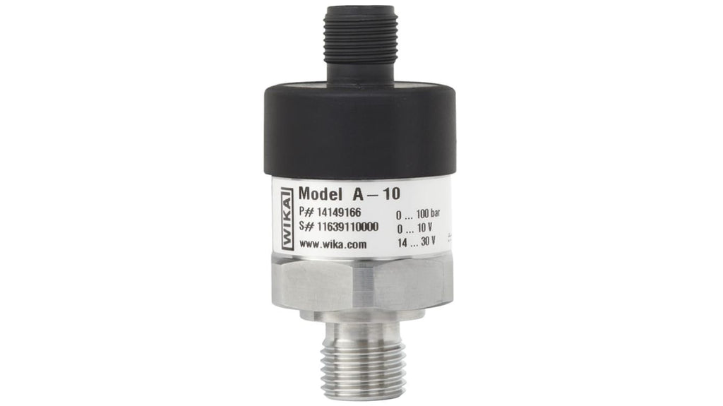 Sensore di pressione WIKA, serie A10, pressione massima 400 bar, uscita analogica 4-20 mA, precisione 0,5%, tempo di risposta inferiore a 4 ms, struttura in acciaio inox, grado di protezione IP65, temperatura operativa da 0 a 80 gradi Celsius, collegamento al processo G1/4, collegamento elettrico M12 x 1, progettato per resistere a 100 milioni di cicli di pressione, certificazione cULus e EAC.