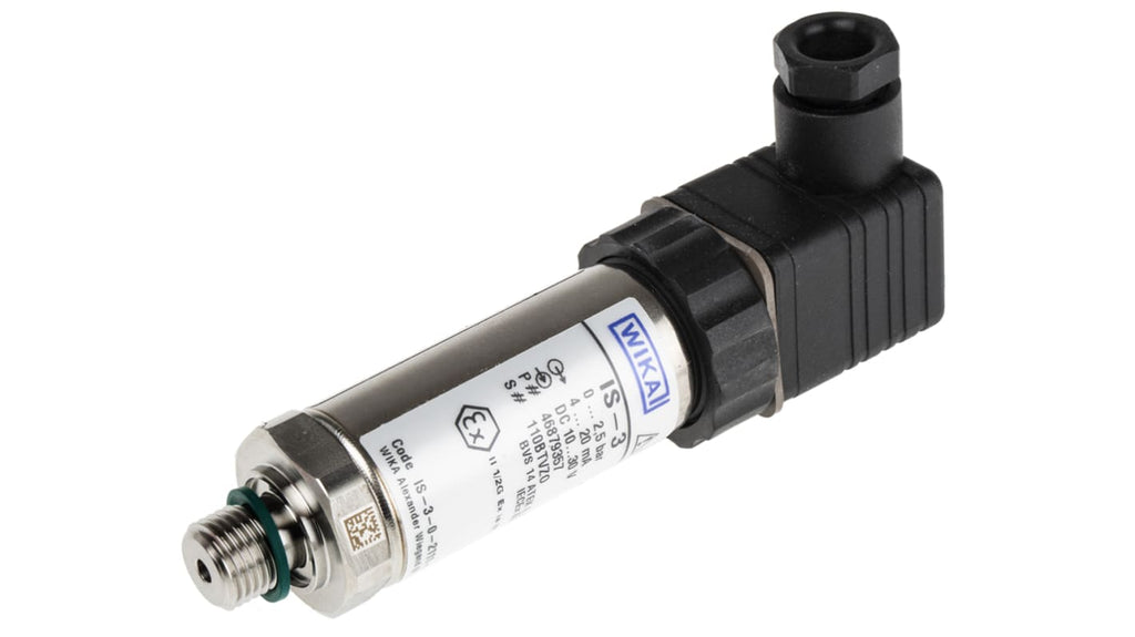Sensore di pressione WIKA, trasmettitore di pressione ATEX Wika IS-3, pressione massima 2.5bar, uscita analogica 4-20 mA, precisione 0.5%, fluido misurato gas e liquido, collegamento al processo G1/4, collegamento elettrico DIN 175301-803 A, tempo di risposta inferiore a 2 ms, tensione di alimentazione 10-30 V c.c., materiale custodia acciaio inox, grado di protezione IP65, temperatura operativa da -20 a +80 gradi, certificazione ATEX e IECEx.