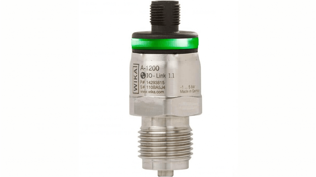 Sensore di pressione relativa WIKA A-1200, lettura da -1 bar a 0 bar, precisione 1 percento, uscita PNP, programmabile tramite IO-Link, design ottimizzato per integrazione OEM, display di stato a LED multicolore a 360 gradi per risoluzione problemi. Codice costruttore 48767890.