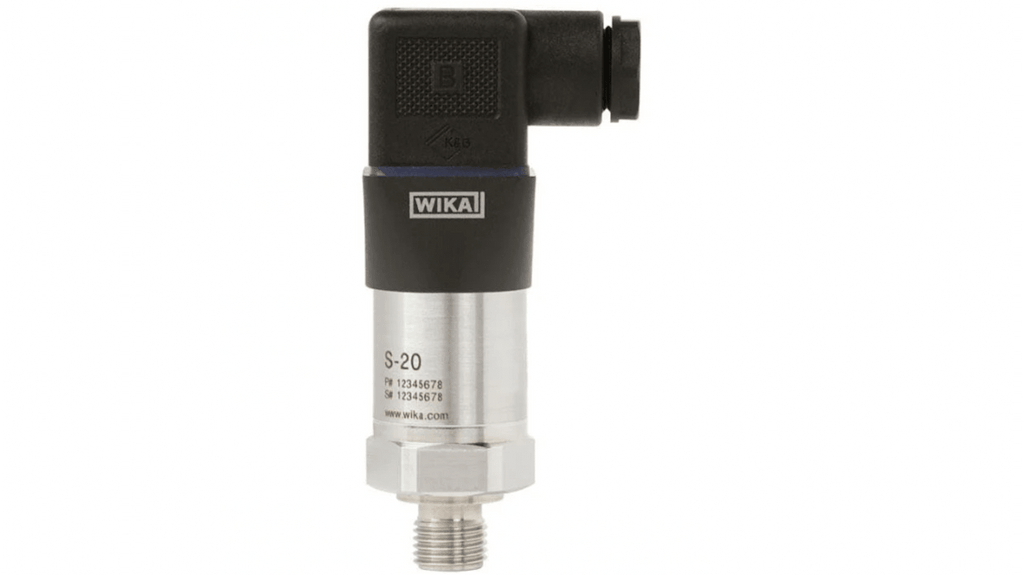 Sensore di pressione relativa WIKA, 100 bar max, uscita analogica. Tipo di lettura: pressione relativa, pressione minima: 0 bar, precisione: 0,25 percento. Design robusto, adatto per applicazioni industriali generiche, resiste a urti, vibrazioni e mezzi aggressivi. Serie S-20.