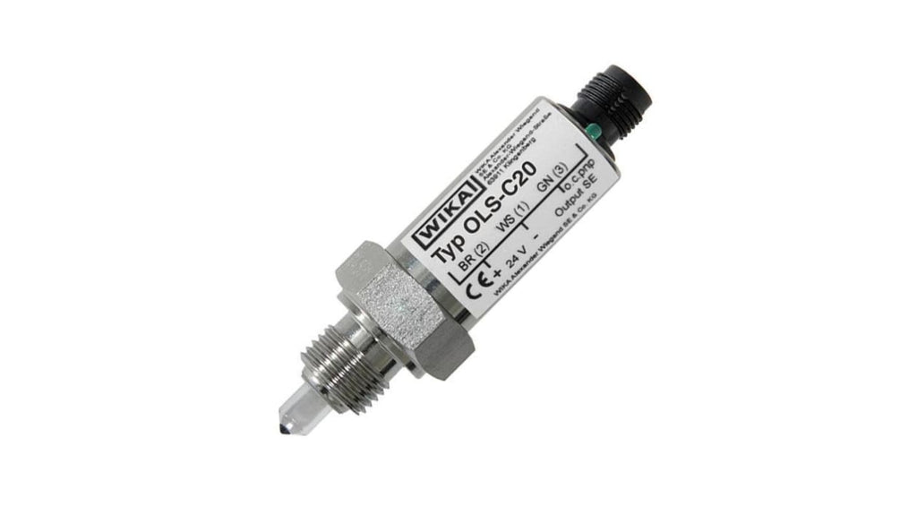 Interruttore di livello WIKA serie OLS-C20, montaggio filettato, uscita PNP, sensore di livello optoelettronico per rilevamento di livelli limite nei liquidi, indipendente da caratteristiche fisiche, design compatto, indicazione visiva dello stato di commutazione, corpo in acciaio inossidabile. Codice costruttore 48799058.