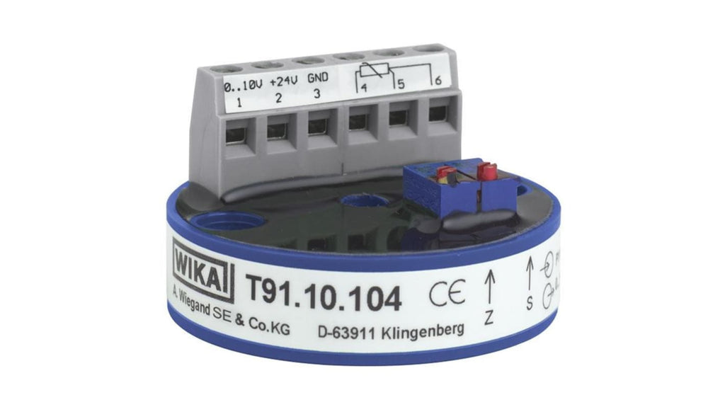 Trasmettitore di temperatura WIKA Analogue Temperature Transmitter T91, ingresso Tipo K, uscita 4-20 mA, range di temperatura 0-1000°C, elevata precisione, compatto, rapporto qualità-prezzo ottimale, progettato per collegamento diretto a strumenti di convalida. Codice costruttore 67124801.